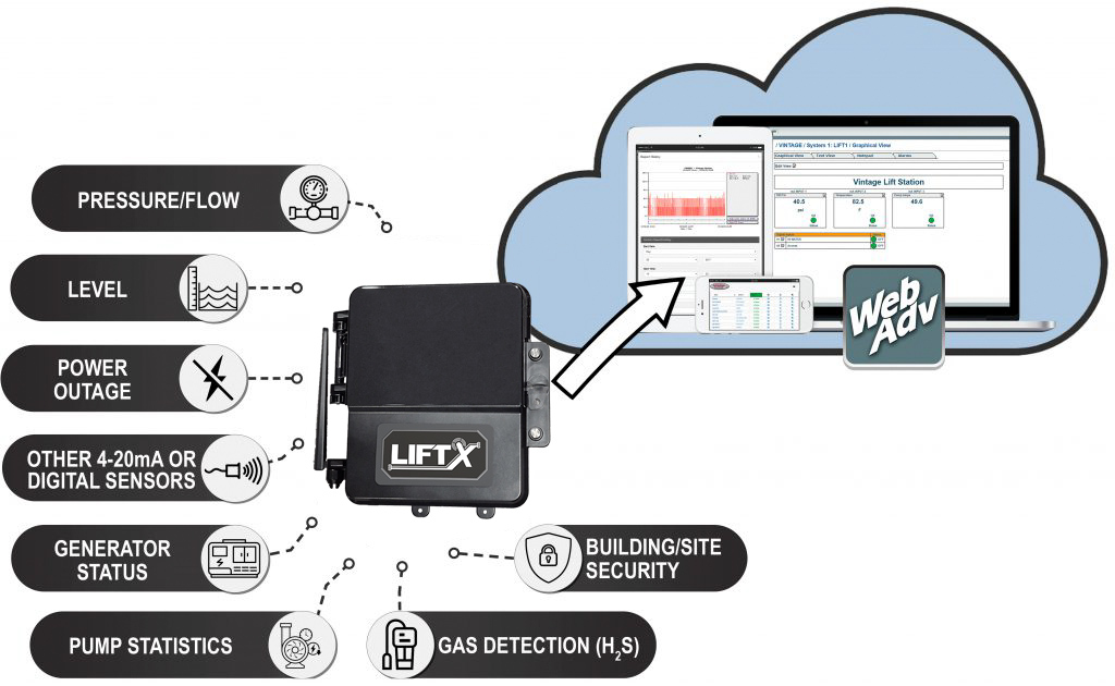 The LIFTX Lift Station Monitor saves time and fuel costs by providing real-time status and alarms for your remote lift stations. Connect sensors such as: high/low level, pressure/flow, pump statistics, generator switch-over, power outage, and even site/building security and the integrated cellular connection and WebAdvantage digital platform provides alerts/alarms, dashboard statistics, custom reporting capabilities and access to settings.